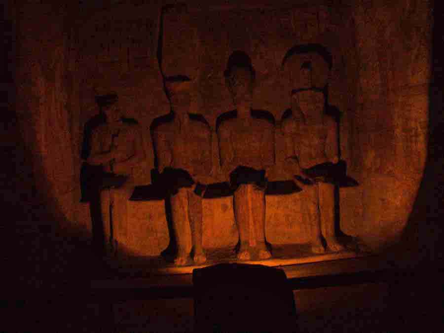 Das Sonnenwunder im Allerheiligsten Die Statue des ganz links sitzenden Ptah von Memphis, eines Erdgottes, der mit dem Reich der Toten verbunden war, bleibt mit Ausnahme seiner linken Schulter außerhalb des Sonnenlichts. Nach Fertigstellung der Tempelanlagen geschah dies während der Regierungszeit von Ramses II. immer im vierten Monat der Jahreszeiten Peret (21. Februar) und Achet (21. Oktober). Die abweichende Länge eines mittleren Sonnenjahres gegenüber dem Kalenderjahr ist dafür verantwortlich, dass sich der Azimut des Sonnenstands jedes Jahr verschiebt. Zusätzlich nimmt der alle vier Jahre eingelegte Schalttag Einfluss auf das Datum des „Sonnenwunders“. Es ergibt sich dadurch eine Schwankungsbreite von einem Tag in beide Richtungen. Aus diesem Grund sind in der Literatur und in Publikationen teilweise unterschiedliche Angaben zum Tag des Sonnenwunders veröffentlicht. |
