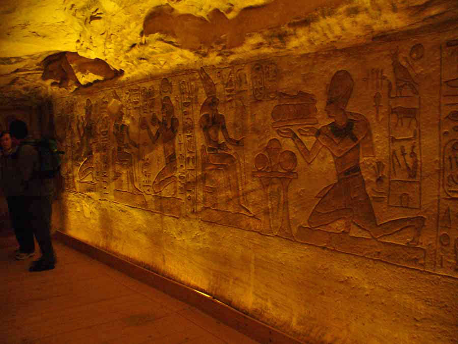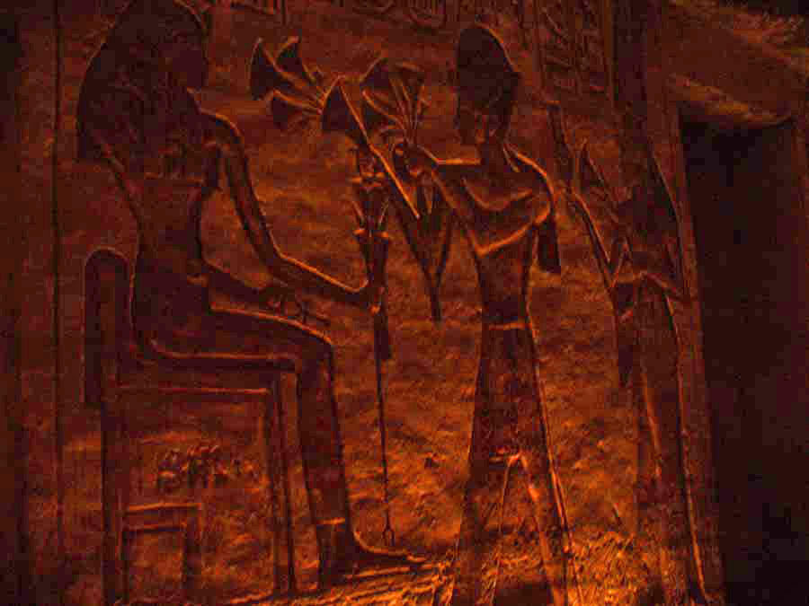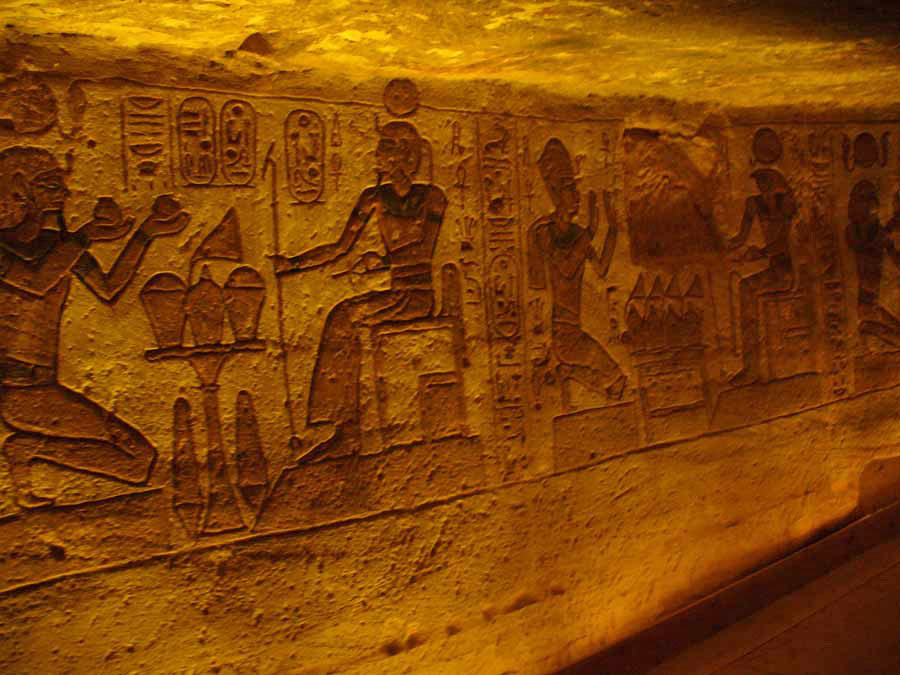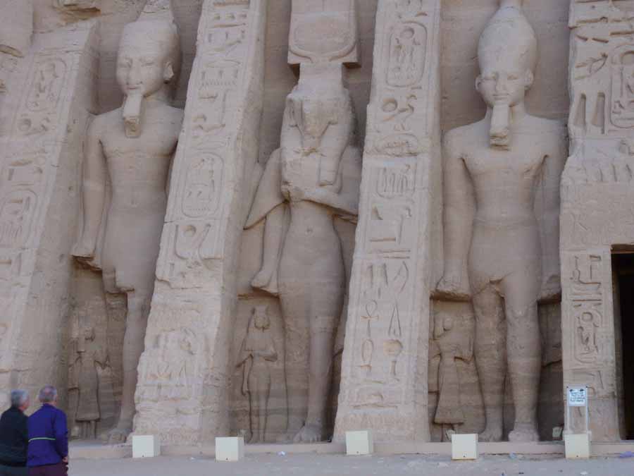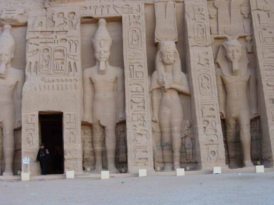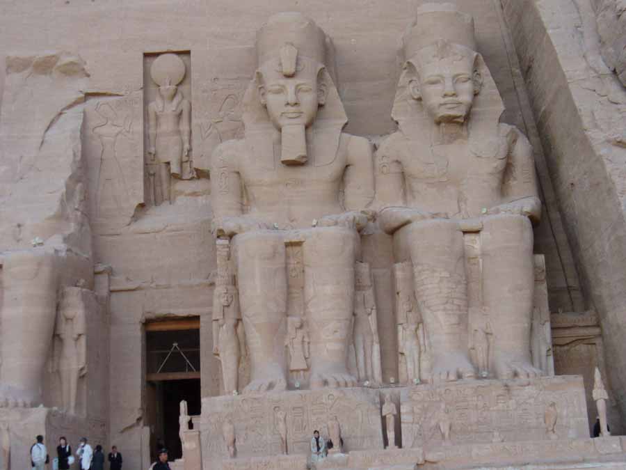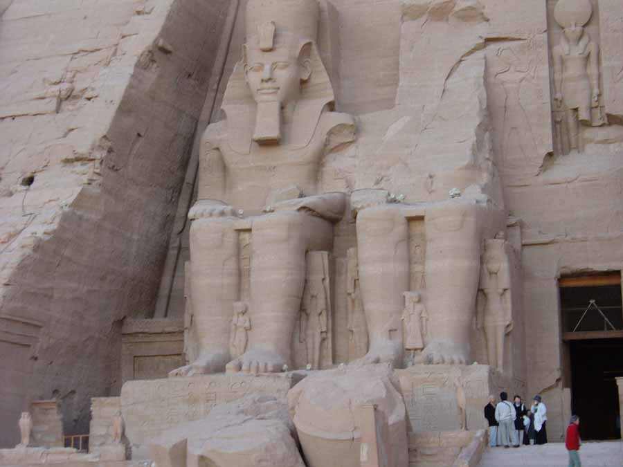 Der große Tempel von Abu Simbel diente insbesondere dem neuen Verständnis der Königsphilosophie von Ramses, der in seiner Eigenschaft als göttlich legitimierter Herrscher gleichberechtigt zu anderen Gottheiten angesehen werden wollte. Dies zeigt sich schon an den vier oben dargestellten etwa 21 Meter hohen Kolossalstatuen des Ramses mit der Doppelkrone Ober- und Unterägyptens (Pschent), dessen Sitzbilder den Eingang zum Großen Tempel „bewachen“. Allein der Abstand zwischen den Ohren jeder Figur beträgt mehr als vier Meter, die Lippenlinie ist mehr als einen Meter lang. Die beiden nördlichen Sitzbilder tragen die Aufschrift: „Ramses, der Geliebte des Amun“ und „Ramses, der Geliebte des Atum“, die südlichen Statuen „Ramses, Sonne der Herrscher“ und „Ramses, Herrscher der beiden Länder“. |