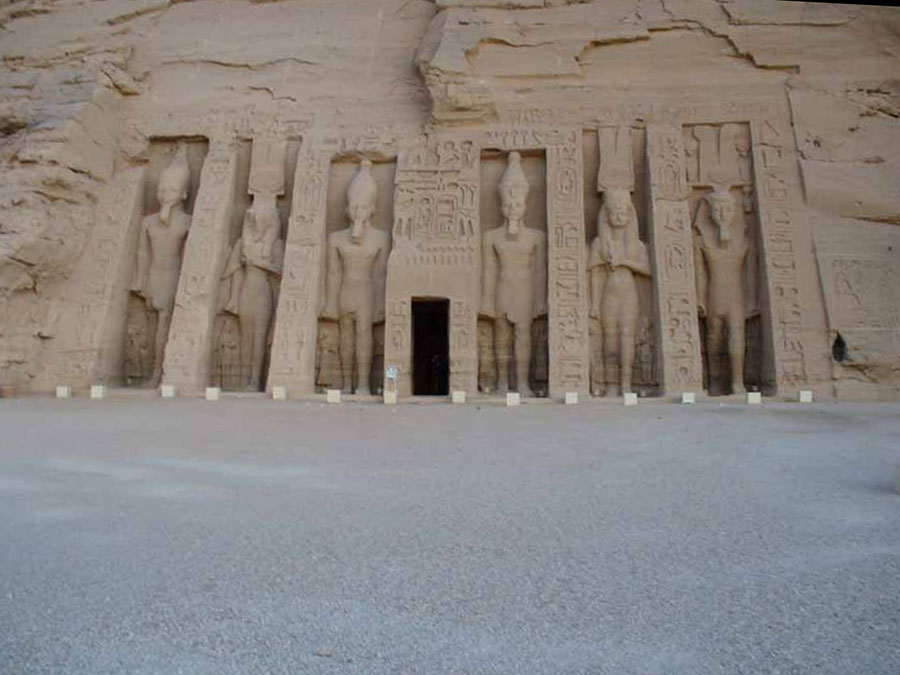 | Rechts neben dem Tempel des Ramses II. befindet sich der Hathor-Tempel, der zur Erinnerung an seine Gemahlin Nefertari errichtet wirde. | ||||
