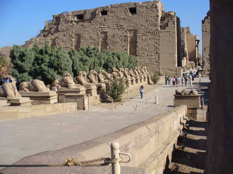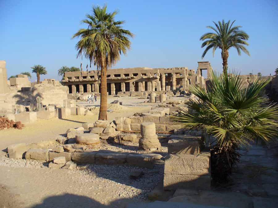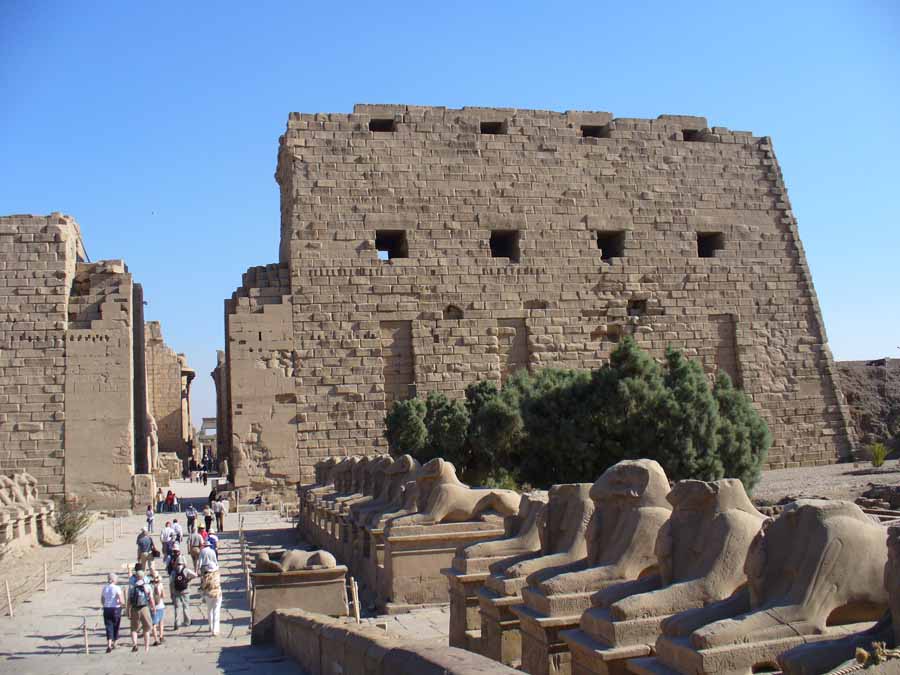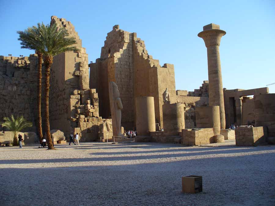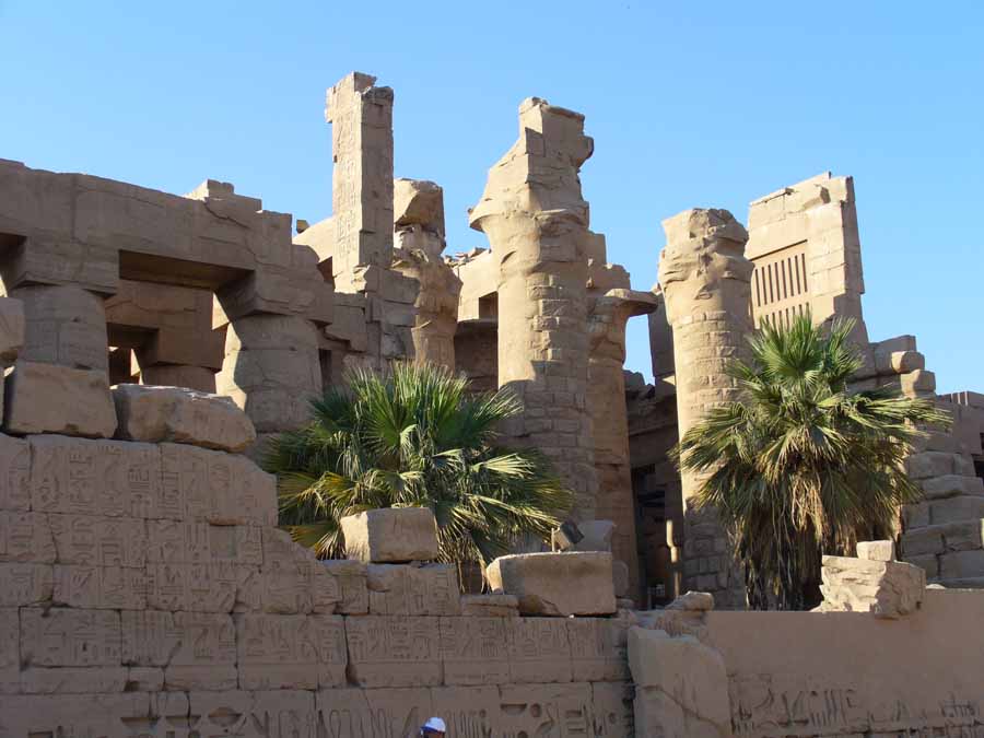 Herausragend unter den Ruinen sind der Tempel des Amun-Re mit seinen insgesamt zehn Pylonen, deren größter ca. 113 Meter breit und ca. 15 Meter dick ist und eine geplante Höhe von ca. 45 Meter aufweist. Neben den Pylonen ist die große Säulenhalle, die von Haremhab begonnen und unter Sethos I. und Ramses II. vollendet wurde, besonders beeindruckend. |