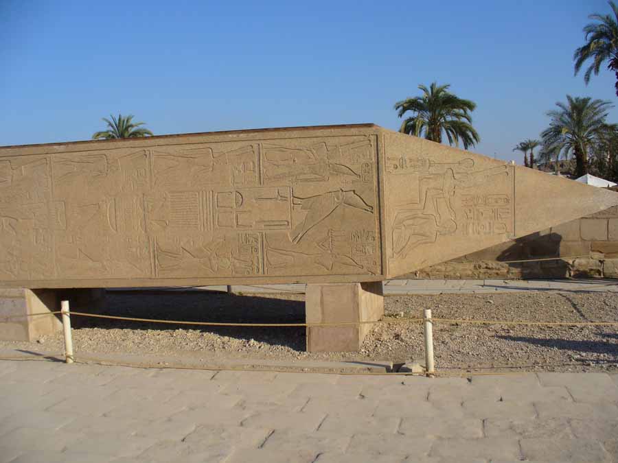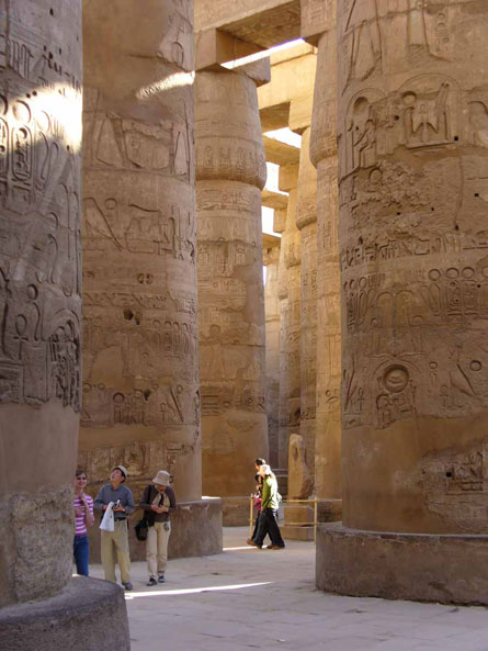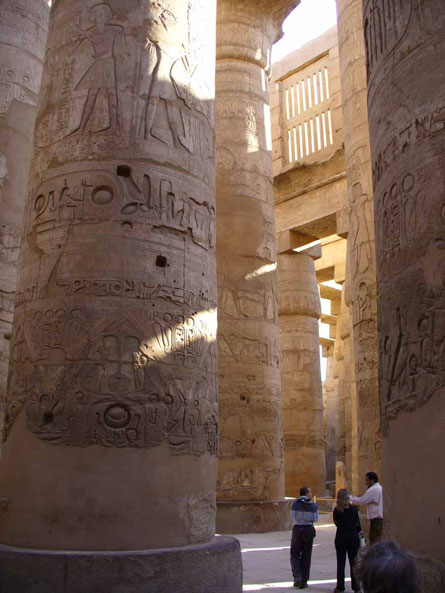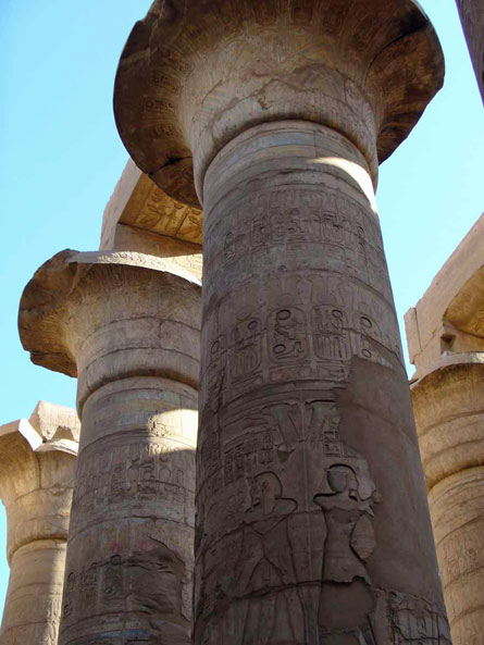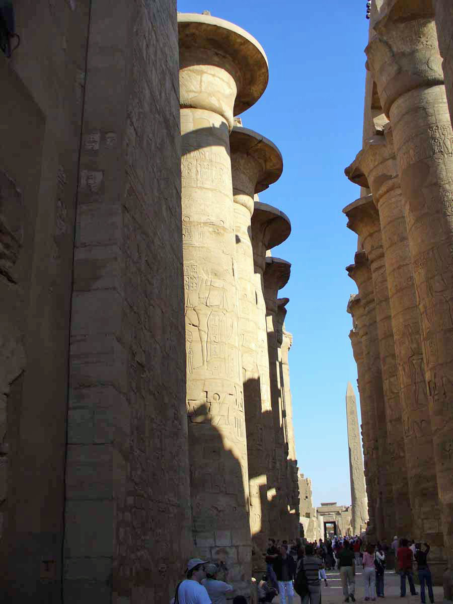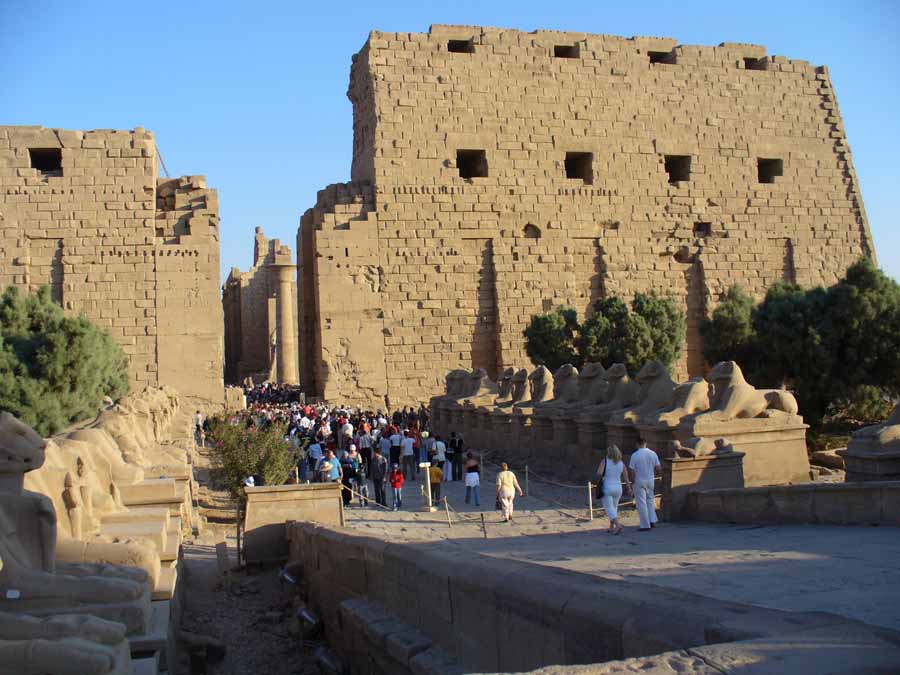 Herausragend unter den Ruinen sind der Tempel des Amun-Re mit seinen insgesamt zehn Pylonen, deren größter ca. 113 Meter breit und ca. 15 Meter dick ist und eine geplante Höhe von ca. 45 Meter aufweist. Neben den Pylonen ist die große Säulenhalle, die von Haremhab begonnen und unter Sethos I. und Ramses II. vollendet wurde, besonders beeindruckend. |