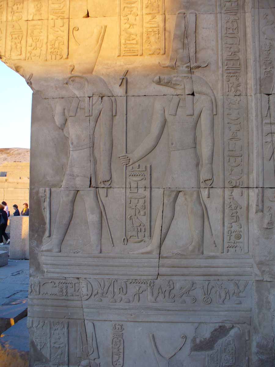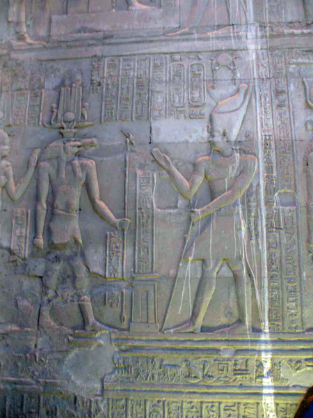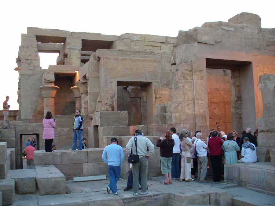 | Die Ruinen des Doppeltempels von Kom Ombo waren lange Zeit bis über die Hälfte durch Sand verschüttet. Sie wurden erst 1893 unter Jacques de Morgan freigelegt und restauriert. Vor dem Tempel stand bis ins 19. Jahrhundert ein großes Mammisi („Geburtshaus“) des Ptolemaios VIII. Euergetes II. Eine etwa zwei Meter über dem Durchschnitt liegende Nilschwemme zerstörte jedoch größtenteils das Gebäude einschließlich des westlichen Teils der Umfassungsmauer. | |||||