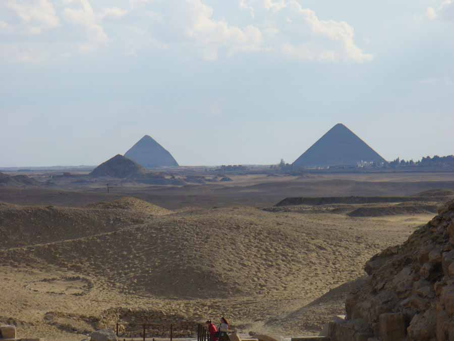 | Blick nach Süden auf die Rote Pyramide und die Knickpyramide des Snofru. | |||||