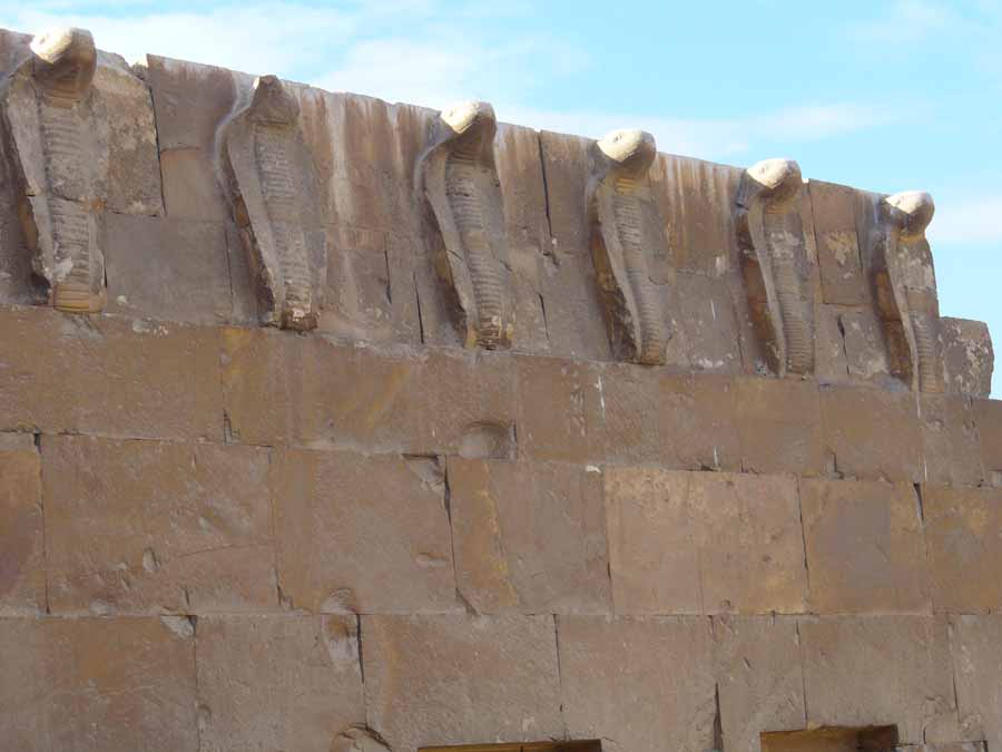 Auffällig ist, dass bestimmte Elemente der ägyptischen Architektur, die in der diesseitigen Architektur aus vergänglichem Material wie Holz und Schilfmatten bestehen, hier nicht fehlen, sondern ohne Funktion in Stein nachgebildet worden sind. |