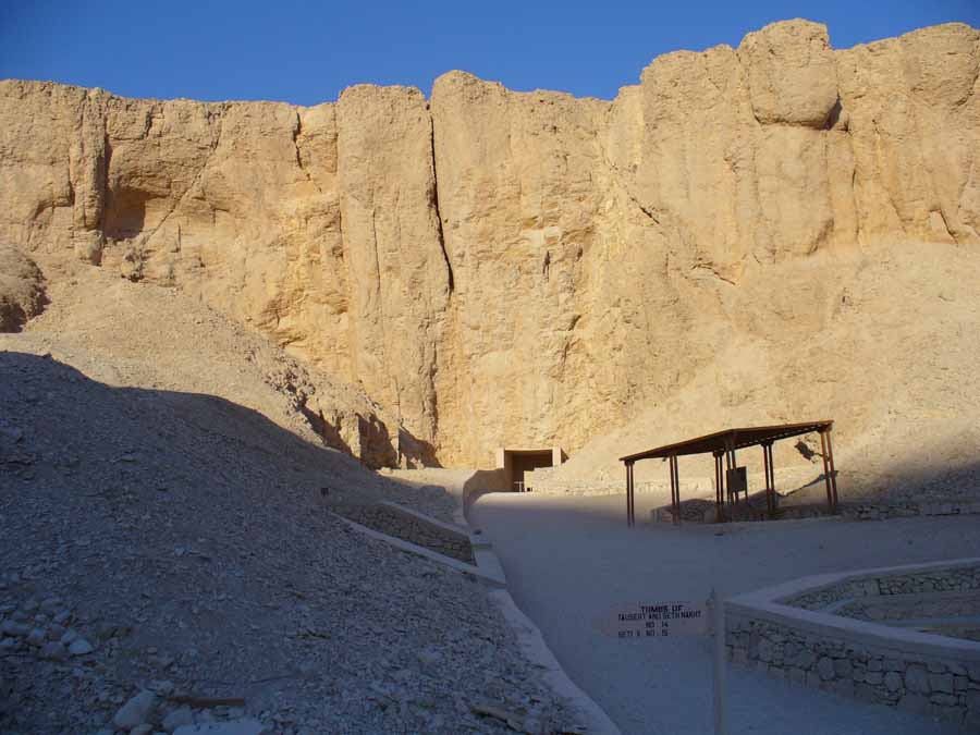 1069 v. Chr., 18. bis 20. Dynastie) zu finden. Das Tal befindet sich am Rand der Wüste und ist gesäumt von hohen Bergen,namentlich durch die natürliche Felspyramide el Korn oder el-Qurn („das Horn“). Nahezu das gesamte Gebiet von Theben-West bildet eine riesige Nekropole. Südlich davon liegt das Tal der Königinnen. |