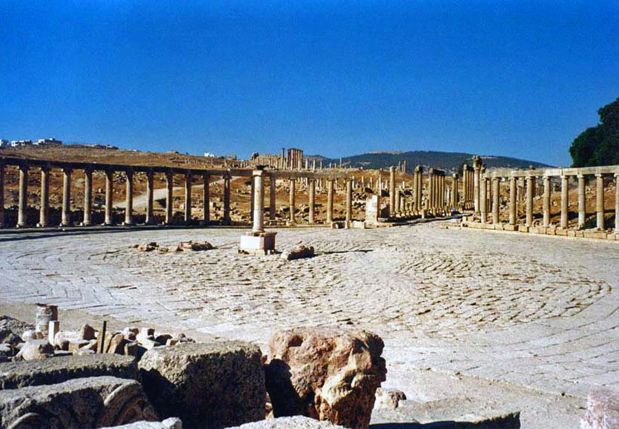 Jerash (auch Gerasa, Jerasch auch Jarash) liegt im Norden Jordaniens und etwa 40 Kilometer nördlich von Amman. Die moderne Stadt hat etwa 40.000 Einwohner und ist Verwaltungszentrum des Gouvernement Dscharasch. Erste Spuren menschlicher Besiedlung in Gerasa stammen bereits aus dem 6. Jahrtausend v. Chr. Es sind Bronzezeitliche- und Eisenzeitliche Spuren erhalten. Aus diesen Zeiten stammt auch der Name Gerasa. Die bis ins 1. nachchristliche Jahrhundert nur unbedeutende Stadt erlebte unter römischer Herrschaft und unter dem römischen Frieden einen schnellen Aufstieg. Sie machte als Handelsstadt zunehmend dem älteren Petra Konkurrenz. Ihre Einwohner gewannen Erz in den nahen Adschlun-Bergen. Ab der Mitte des ersten Jahrhunderts führte dieser Aufschwung zu reger Bautätigkeit und einer reichen, auch heute noch beeindruckenden Fülle von Baudenkmälern. |