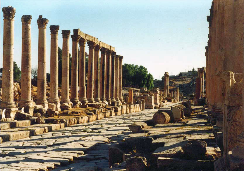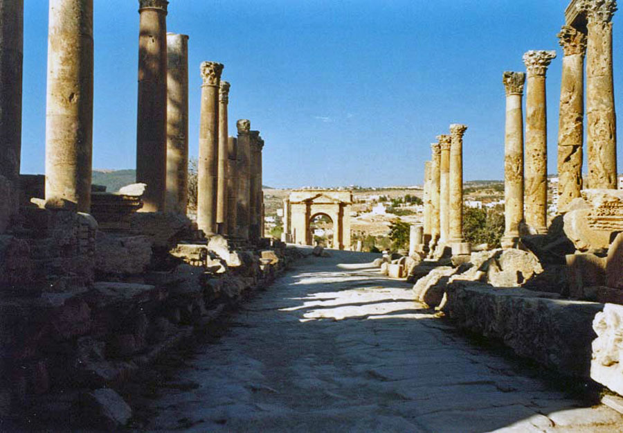 Im Jahr 106 n. Chr. wurde Gerasa Teil der römischen Provinz Arabia Petraea. In den folgenden Jahrzehnten führten die römischen Expansionskriege in Vorderasien zu einem weiteren Bedeutungsgewinn; es entstanden gut ausgebaute Straßen nach Pella, Philadelphia, Dion und zur Provinzhauptstadt Bos(t)ra. Kaiser Hadrian stattete der Stadt im Winter 129/130 einen Besuch ab. In der Spätantike änderte sich die politische Situation in der Region grundlegend und die Stadt verlor an Bedeutung. In diese Zeit fällt auch der Aufstieg des Christentums und der Bau vieler Kirchen. |