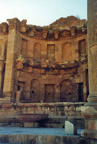 | Das prächtige, 22 Meter breite Nymphäum stammt ebenfalls aus dem 2. Jahrhundert. Das den Wassernymphen geweihte zweigeschossige Heiligtum ist eines der besterhaltenen Gebäude des antiken Gerasa. Das untere Stockwerk des Nymphäums war mit Marmor verkleidet. Das obere war mit Fresken verziert, die zum Teil noch erkennbar sind. Auffällig ist die Dachkonstruktion – eine Halbkuppel mit gesprengtem Giebel, die sich über einem großen Prachtbrunnen wölbt. Die Brunnenfassade wurde in Nischen unterteilt, in denen sich Statuen befanden. Einige Statuen hielten große Behälter, aus denen sich Wasser in das Bassin des Prachtbrunnens ergoss. Ein komplexes Leitungssystem führte das Wasser aus der Umgebung heran. | |||||