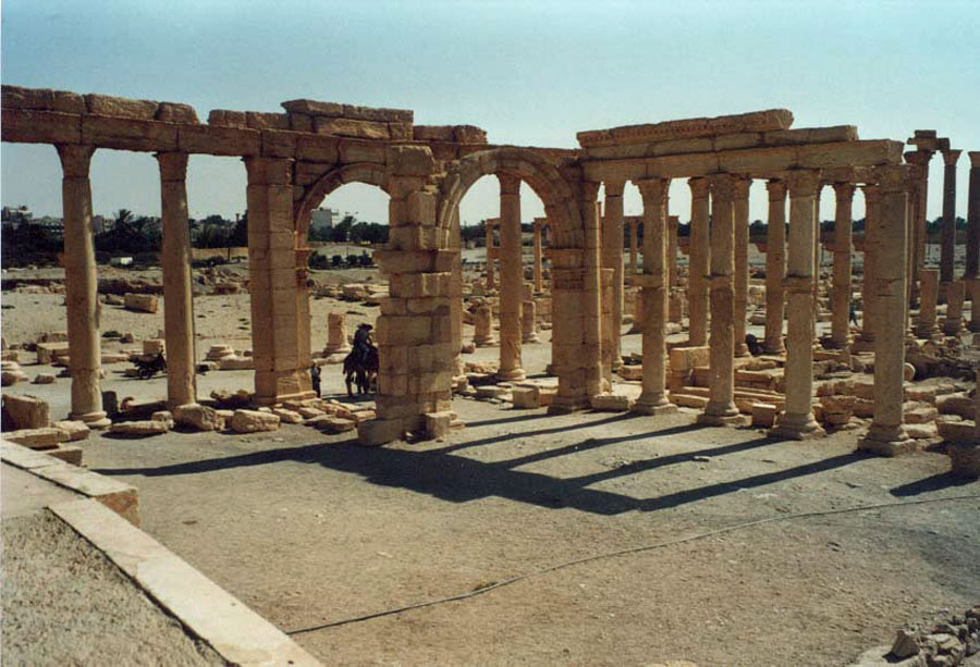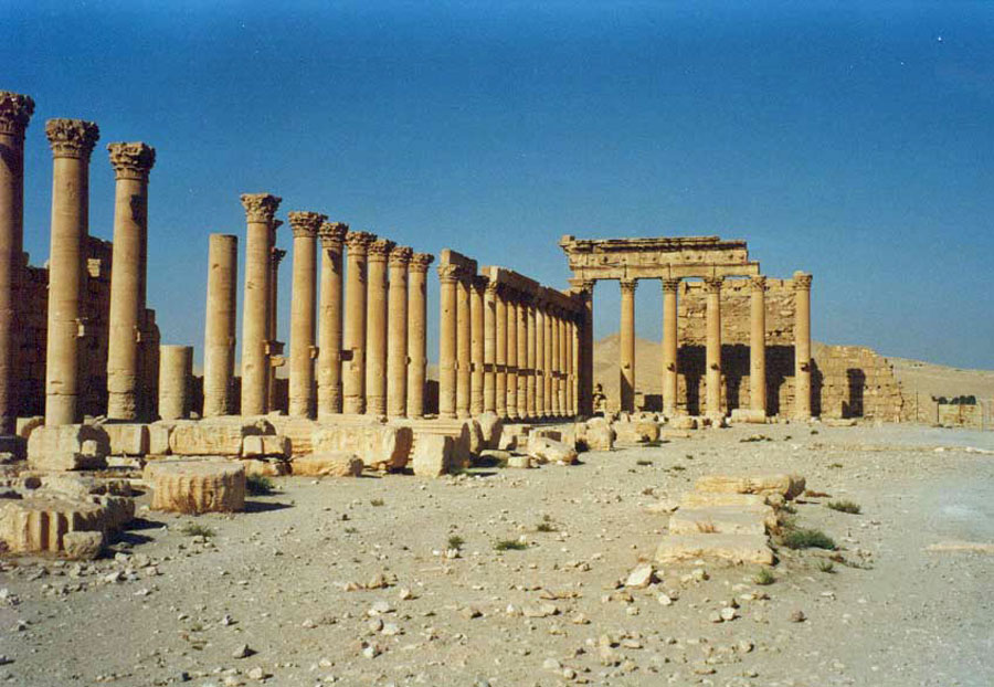 | Der rund 2000 Jahre alten Triumphbogen (Hadrianstor) an der Prachtstraße (Anfang Oktober 2016 vom IS gesprengt) | |||||