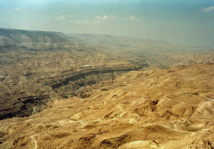 | Durch das Wadi Mujib fließt der biblische Arnon, sofern er nicht oberhalb der Mujib-Talsperre während des Sommers zuweilen trocken fällt. | ||